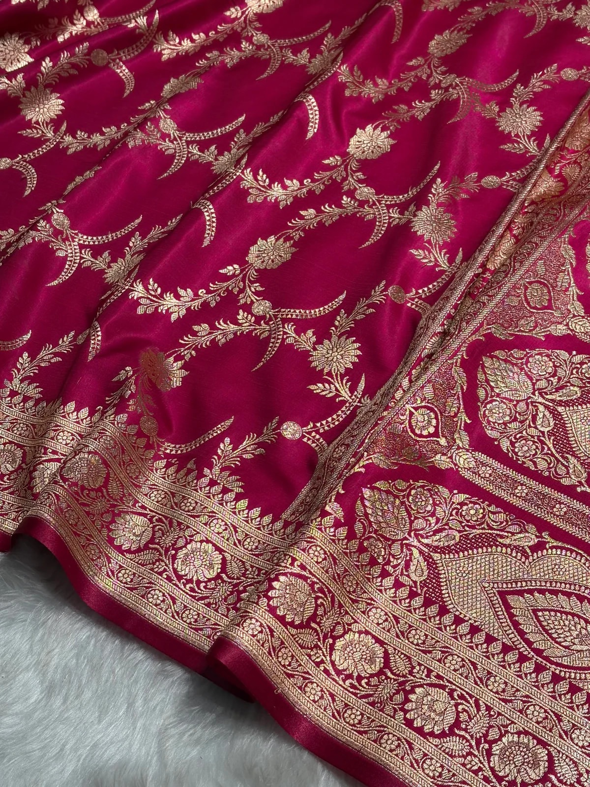 Indulge in timeless elegance with our Banaras Silk Satin Saree – crafted in rich satin-finish Banarasi silk that drapes beautifully with a luxurious fall. The smooth glossy texture enhances the colour depth, making it look royal yet effortless for any occasion.