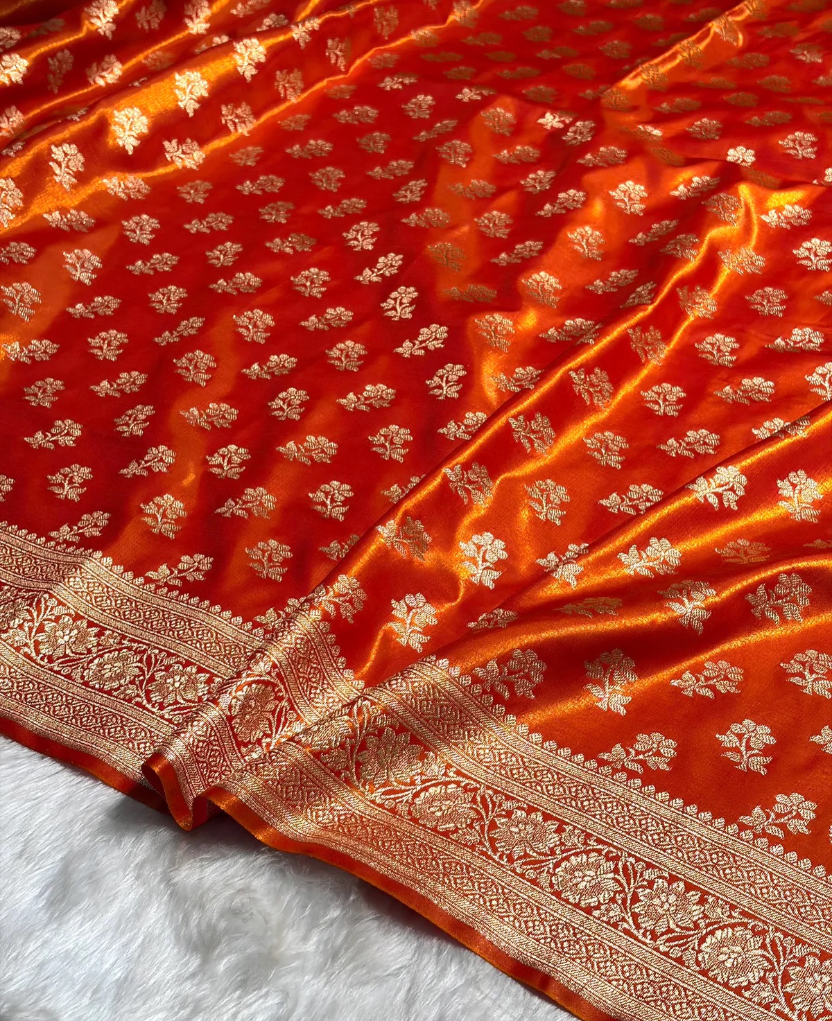 Indulge in timeless elegance with our Banaras Silk Satin Saree – crafted in rich satin-finish Banarasi silk that drapes beautifully with a luxurious fall. The smooth glossy texture enhances the colour depth, making it look royal yet effortless for any occasion.